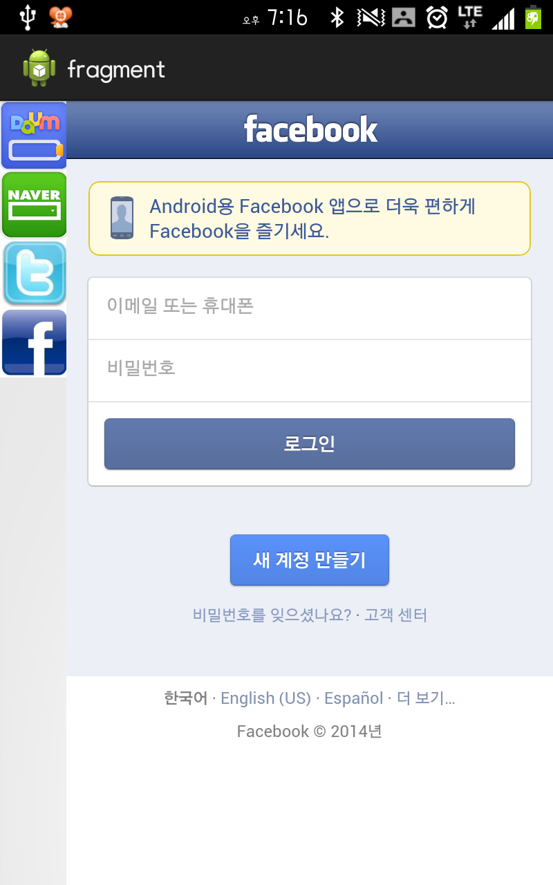 1 2 3 4 5 6 7 8 9 10 11 12 13 14 15 16 17 18 19 20 21 22 23 24 25 26 27 28 29 30 31 32 | public class MainActivity extends Activity implements OnClickListener{ WebView webview; Button daum; Button naver; Button facebook; Button twit; String url="http://m.facebook.com"; @Override protected void onCreate(Bundle savedInstanceState) { super.onCreate(savedInstanceState); setContentView(R.layout.activity_main); webview=(WebView)findViewById(R.id.webview); daum=(Button)findViewById(R.id.daum); .......... } @Override public void onClick(View v) { // TODO Auto-generated method stub switch(v.getId()){ case R.id.daum: url="http://m.daum.net"; webview.loadUrl(url); break; ......... ......... | cs |