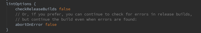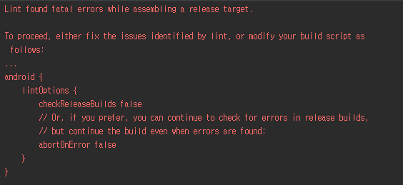build.gradle의 android 안에 lintOptions을 위 그림과 같이 추가해주시면 됩니다.