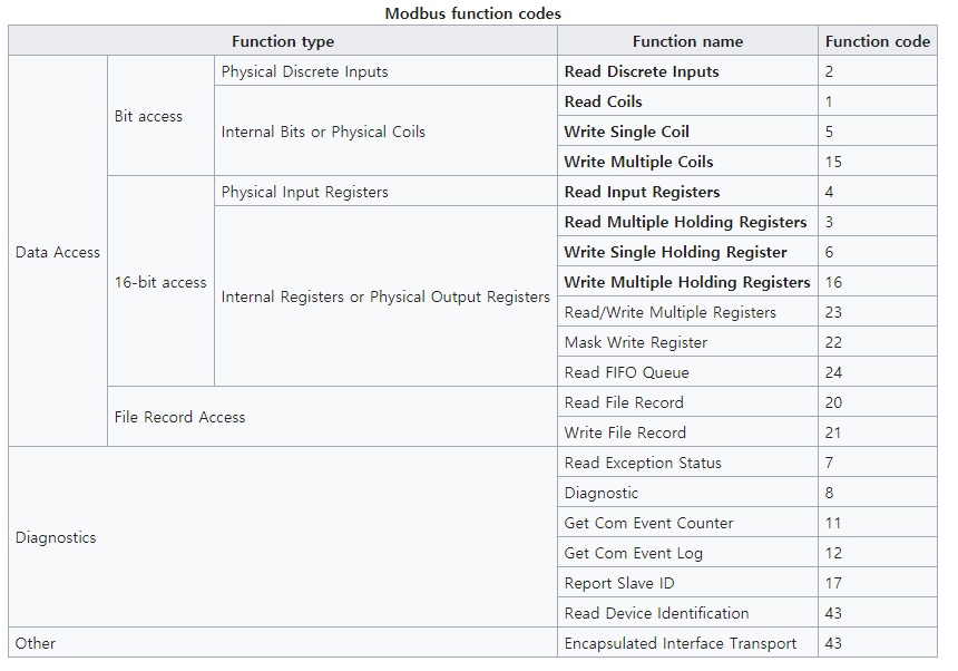 Modbus의 Function code는 목적에 따라 정해져 있습니다.