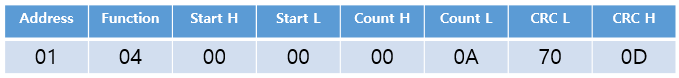 첫번째 예로 function code 4번을 사용하여 0번레지스터부터 9번레지스터까지 읽어오는 예입니다.