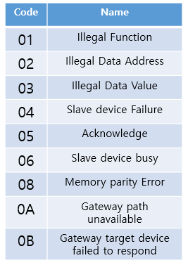그리고 바로 뒤에 Exception Code가 오는데 이 code는 01~0B까지 있습니다.