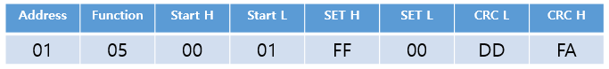 Function 05의 APU는 Coil주소와 SET Flag인 0xFF00만 지정해 주면 됩니다.