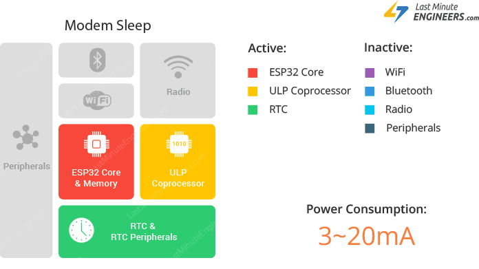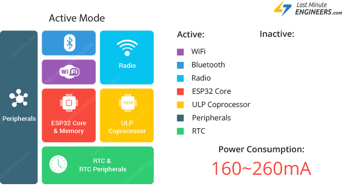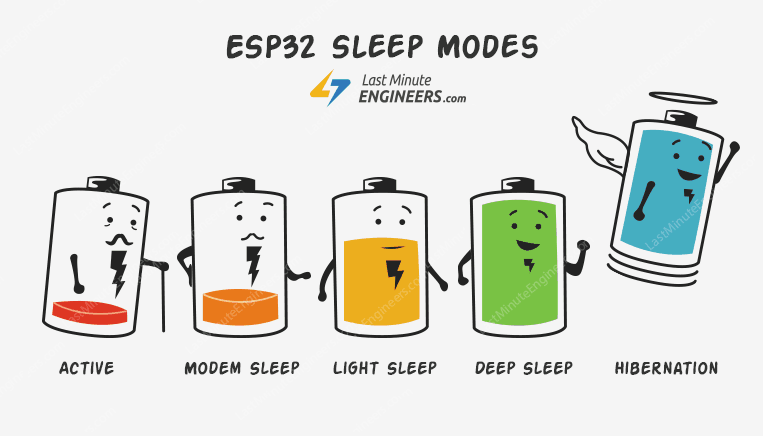 ESP32의 경우 총 5가지 모드가 있으며, 모드에 따라 배터리 소모량이 달라집니다.