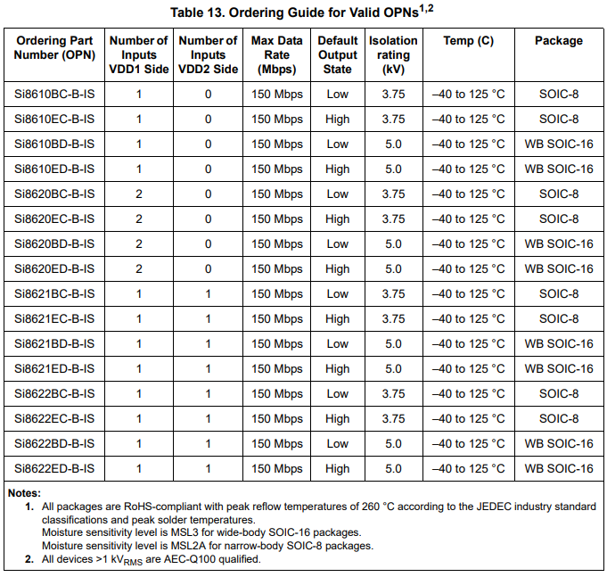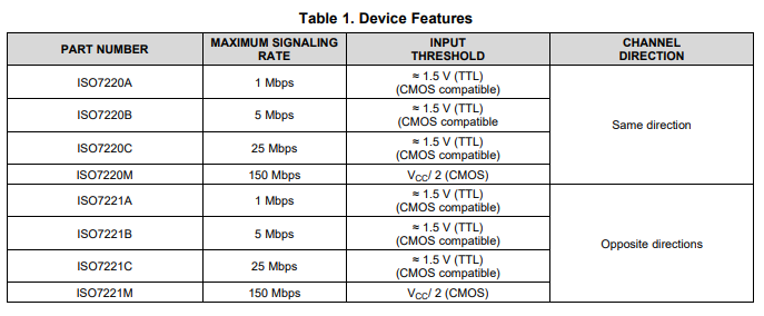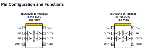 시리즈의 구분은 ISO722x와 같은 패키지인 8SOIC기준으로 봤을때 아래와 같이 구분이 됩니다.