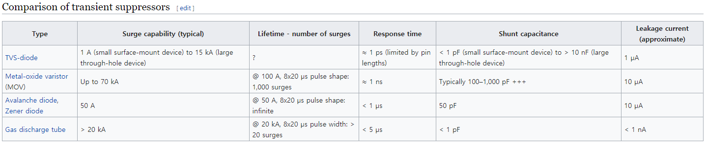 MOV(Metal-oxide Varistor). Avalanche diode, Zener diode, Gas discharge tube 등이 있습니다.