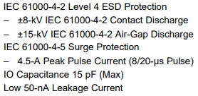 TI의 TPD2E007의 경우 IEC 61000-4-2 Level 4와 IEC 61000-4-5를 만족하며 RS-232, RS-485 모두 사용하다고 나옵니다.