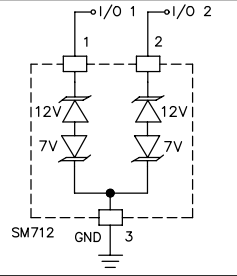 SM712의 경우 -7V~12V라인을 보호할 수 있게 되어있어 712인듯 합니다.