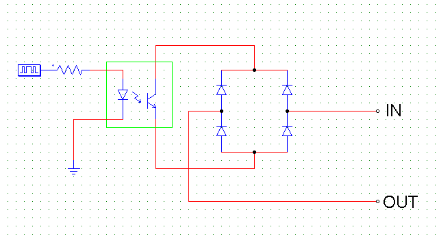 왼쪽의 포토커플러가 ON이 되면 오른쪽에 있는 브릿지 다이오드의 IN과 OUT이 도통이 됩니다.