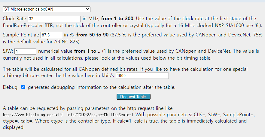 저의 경우 ST를 선택한 후, 사용 클럭인 32Mhz, 그리고 baudrate를 1000kbps로 설정한 후 Request Table을 클릭합니다.