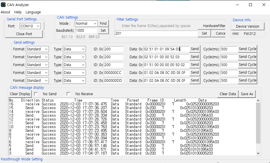 CAN Analyzer를 사용하여 데이터를 보내보니 정상적으로 응답데이터가 오는걸 확인할 수 있습니다.