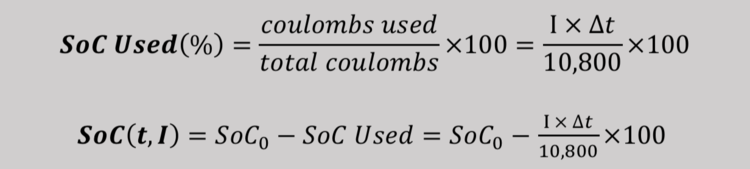 SoC=( 1- ( 사용한 전류량 X 사용한 시간 / 총 전류량 ) ) X 100%