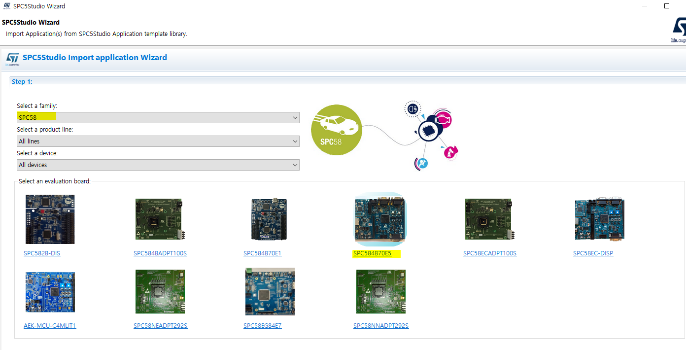 여러 개발보드들이 나오는데 가장 비슷한 SPC584B70E5를 선택합니다.