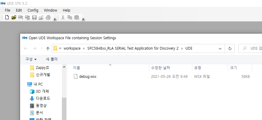open workspace를 선택하여 SPC5 STUDIO의 테스트 코드 폴더로 이동후 하위의 UDE폴더로 이동 후