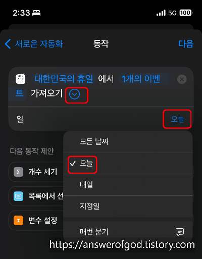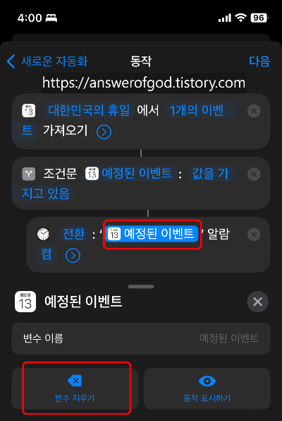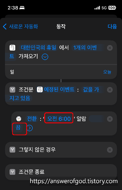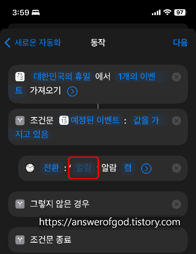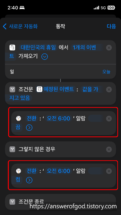이제 조건문을 통해 공휴일인 경우와 아닌 경우의 알람을 켜고 꺼주기만 하면됩니다.