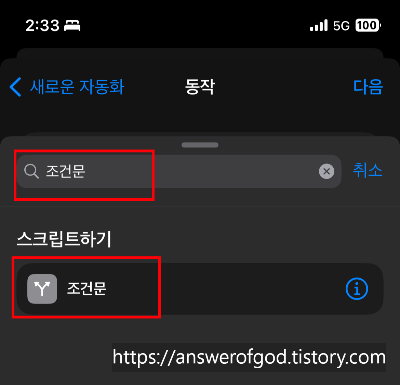 하단의 검색창을 이용하여 '조건문'을 검색하여 '조건문'을 선택해 줍니다.