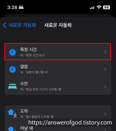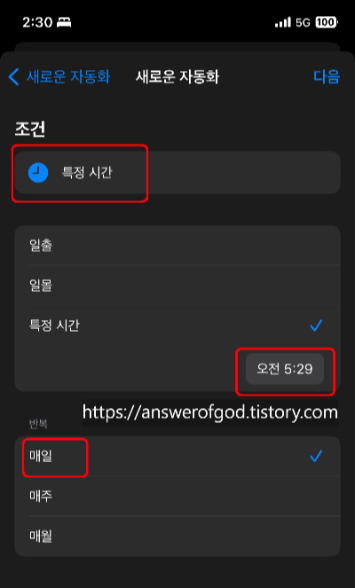 알람은 매일 매일 특정시간 반복이므로 '특정시간'을 누릅니다.