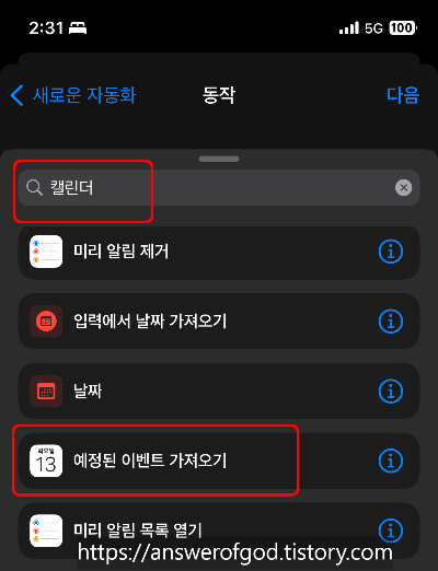 '캘린더'를 검색하면 많은 항목들이 나오는데 당황치 말고, 스크롤을 내려 '예정된 이벤트 가져오기'를 선택합니다.