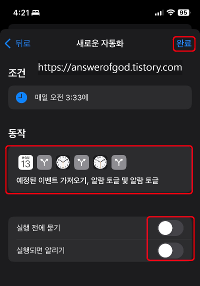 모든 것이 완료되었으면 오른쪽 상단의 '완료'를 눌러 자동화 만들기를 끝내줍니다.