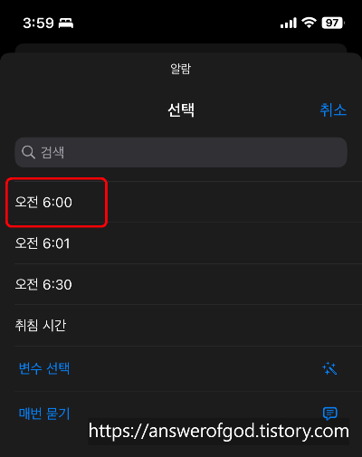 특정시간중 알람이 울리기 전 시간으로 선택을 해줍니다.