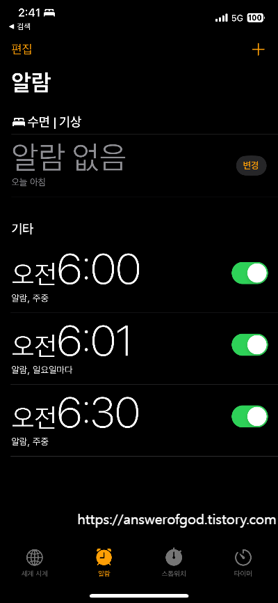 '알람'을 선택하면 이미 설정해 놓은 알람들이 나타납니다.