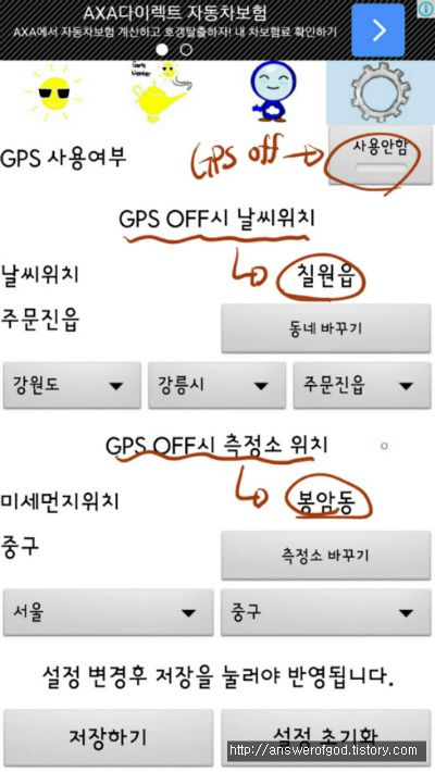 GPS를 사용하지 않게되면 설정해놓은 곳에서 날씨와 대기 정보를 가져오게 됩니다.