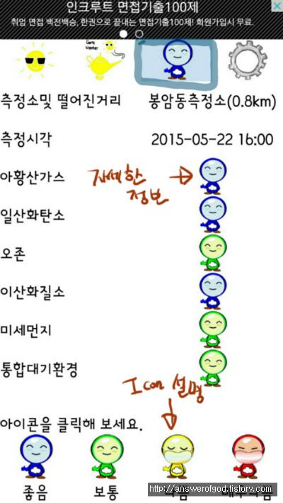 대기정보를 탭해보면 대기정보 등급이 아이콘으로 표시 됩니다.