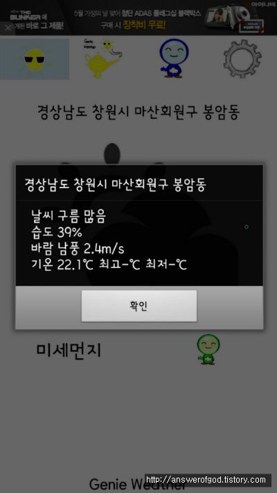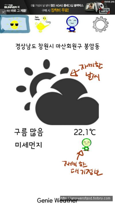 날씨 아이콘을 누르게 되면 좀 더 자세한 현재 날씨를 볼 수 있으며, 미세먼지 아이콘을