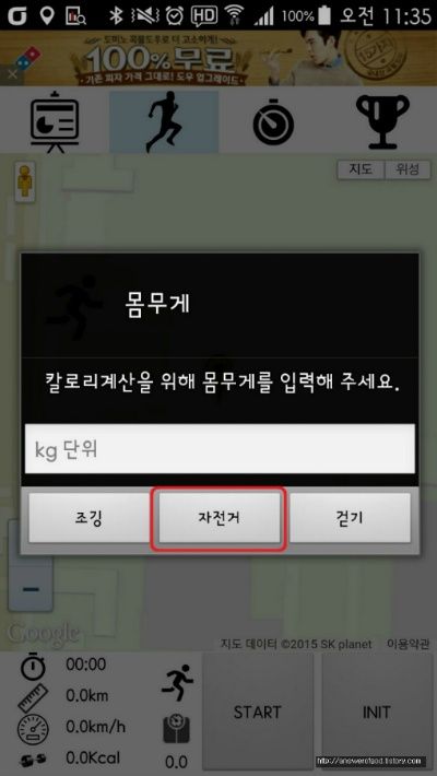 운동시작전 운동종류와 몸무게 변경시 위의 빨간박스안을 클릭하시면 변경할 수 있습니다.