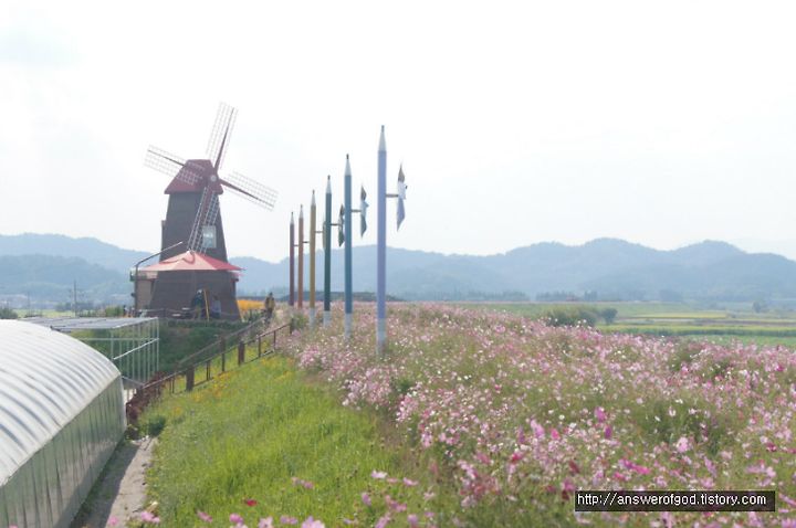 뚝 위에는 양옆으로 코스모스가 피어있습니다.