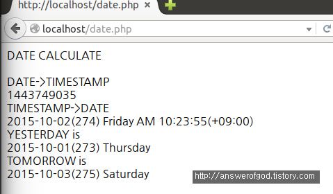 1 2 3 4 5 6 7 8 9 10 11 12 13 14 15 16 17 18 19 20 21 22 | <?php echo 'DATE CALCULATE <br><br>'; $today=date_create(); echo 'DATE->TIMESTAMP <br>'; $timestamp=date_timestamp_get($today); echo $timestamp.'<br>'; echo 'TIMESTAMP->DATE <br>'; date_timestamp_set($today,$timestamp); echo date_format($today, 'Y-m-d(z) l A h:i:s(P)').'<br>'; echo 'YESTERDAY is<br>'; $yesterday=date_create(); date_sub($yesterday,date_interval_create_from_date_string('1 days')); echo date_format($yesterday,'Y-m-d(z) l').'<br>'; echo 'TOMORROW is<br>'; $tomorrow=date_create(); date_add($tomorrow,date_interval_create_from_date_string('1 days')); echo date_format($tomorrow,'Y-m-d(z) l').'<br>'; ?> | cs |
