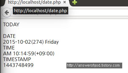 1 2 3 4 5 6 7 8 9 10 11 | <?php echo 'TODAY<br><br>'; echo 'DATE <br>'; echo date('Y-m-d(z) l').'<br>'; echo 'TIME <br>'; echo date('A h:i:s(P)').'<br>'; echo 'TIMESTAMP <br>'; echo date('U').'<br>'; echo '<br><br>'; ?> | cs |